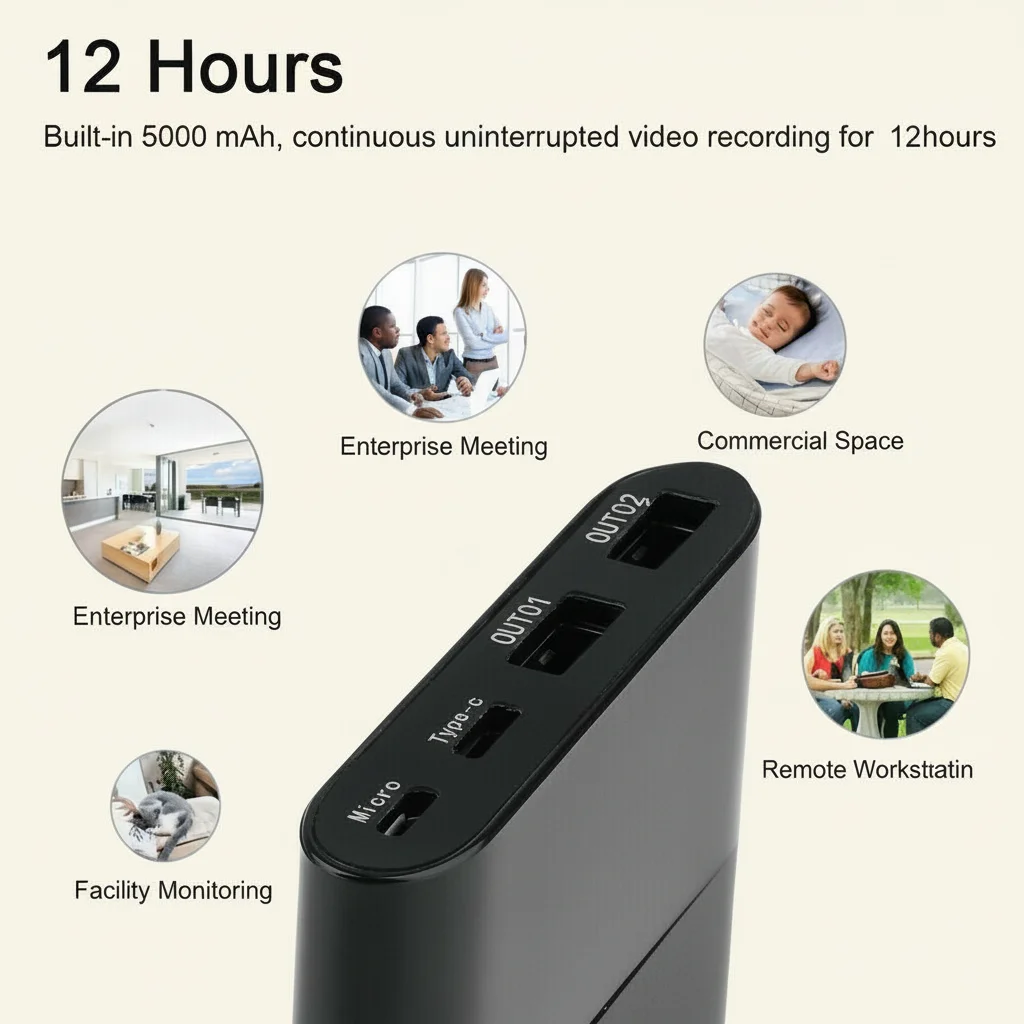 The high-capacity 5000mAh lithium-ion battery supports approximately 7 hours of continuous recording, significantly longer than typical mini cameras. This reduces the need for frequent maintenance and recharging in fixed installations.