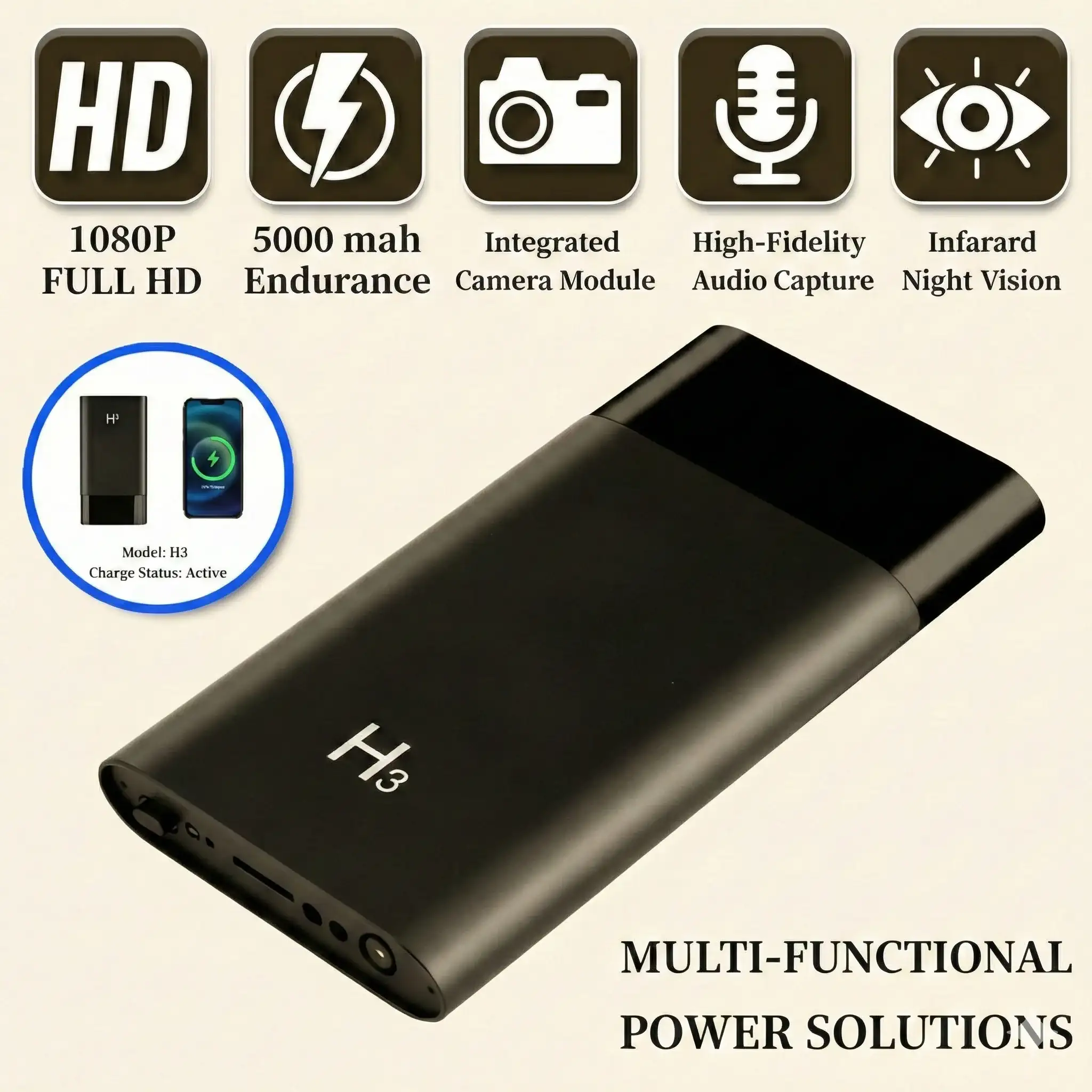 - Dual Functionality: Operates as a standard 5000mAh power bank to charge mobile devices, enhancing its disguise and practical value for the end-user.