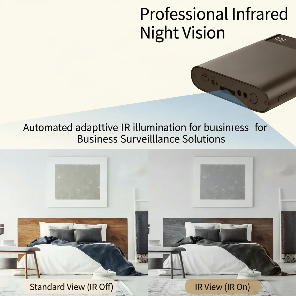 - Covert Night Vision: Equipped with non-luminous infrared (IR) LEDs, the device provides clear visibility up to 8 meters in complete darkness without any visible glow, ensuring 24/7 monitoring capability.