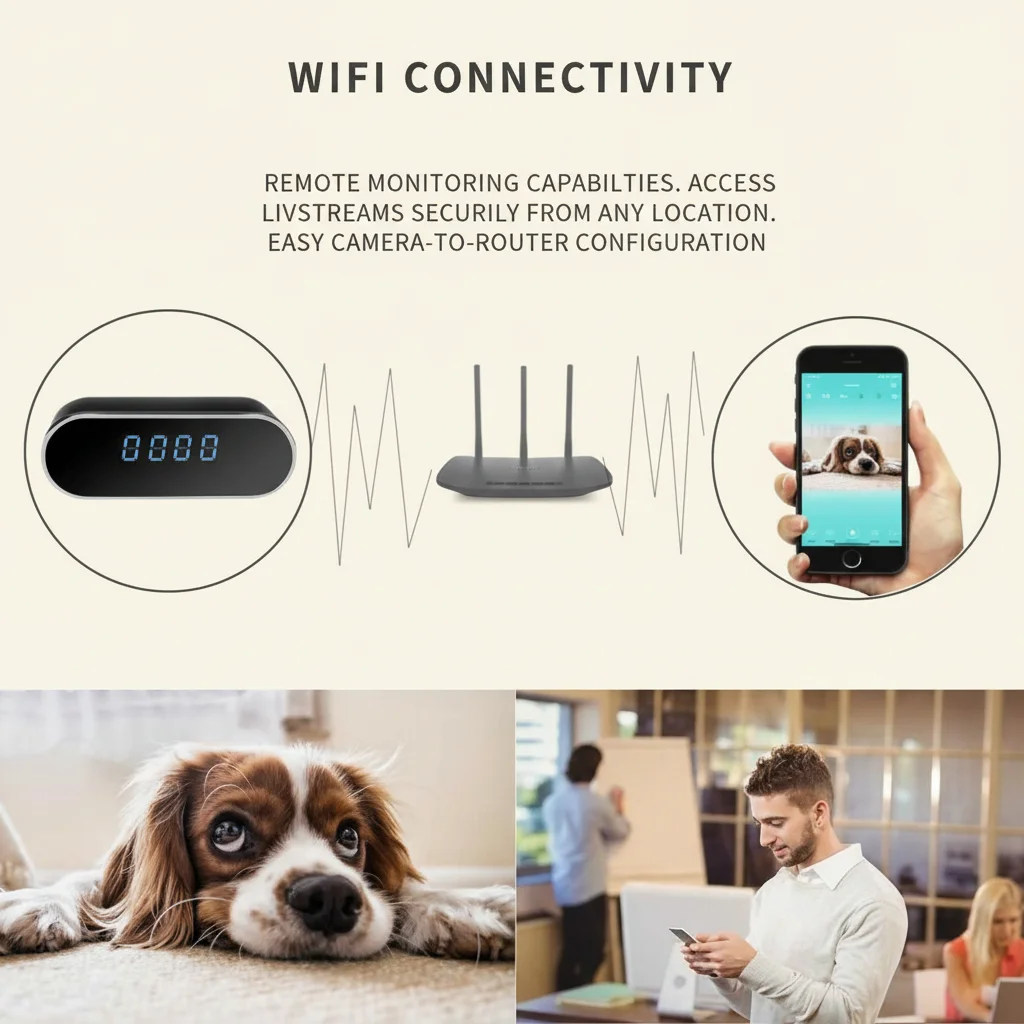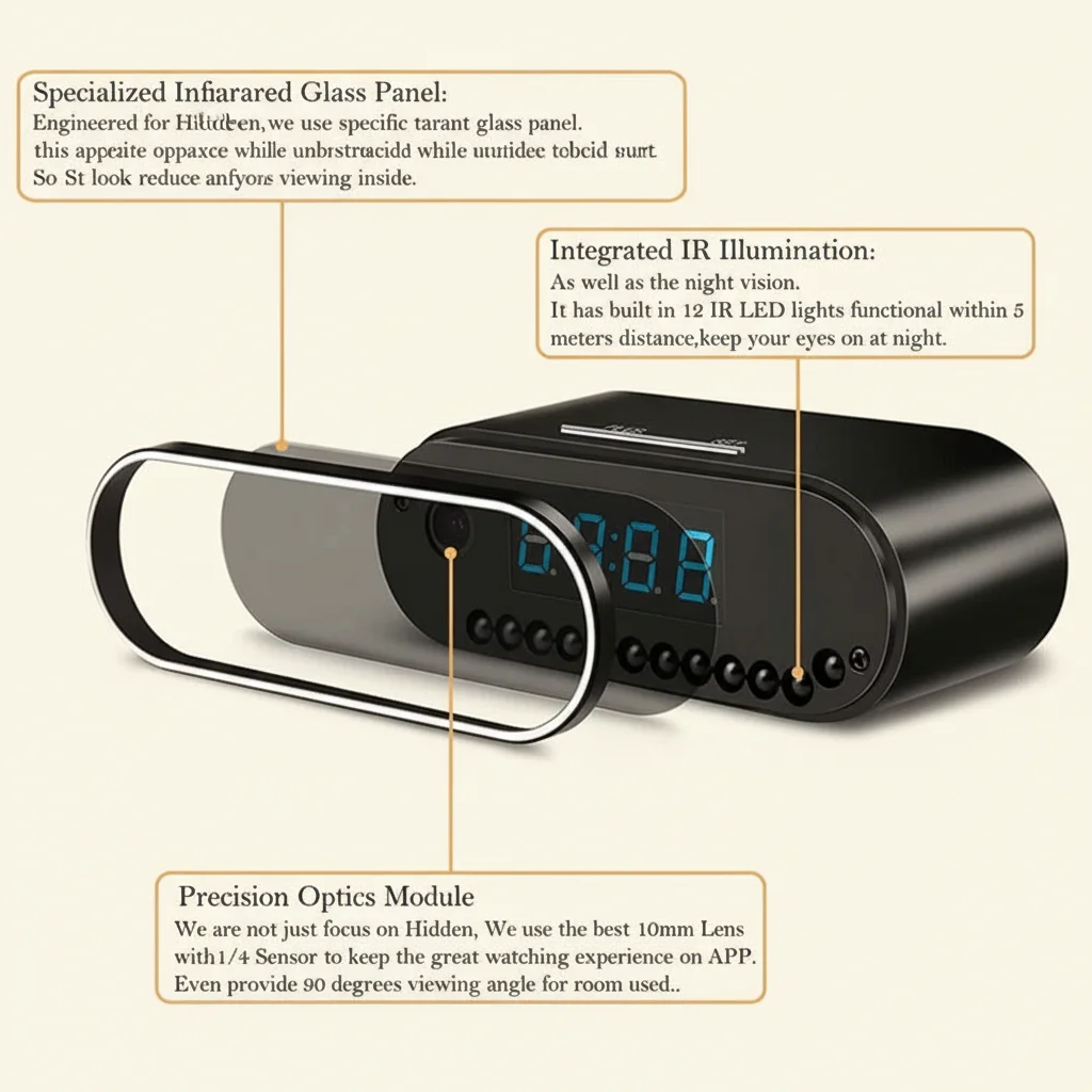 - Completely Covert Design: Housed within a modern, fully functional digital clock with a mirrored front panel that effectively conceals the camera lens for undetectable surveillance.