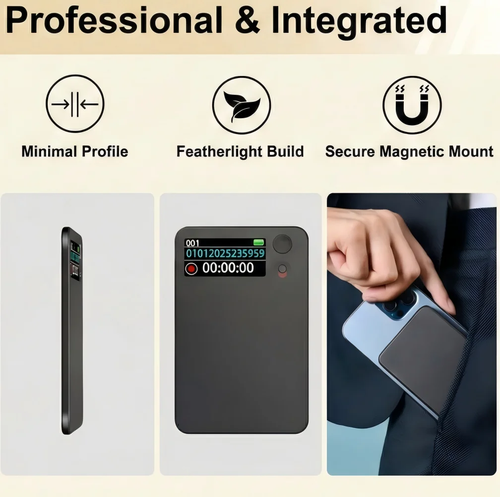 - Discreet and Portable Design: With an ultra-thin 3.6 mm profile and a weight of only 32 grams, the device is highly portable. An integrated magnet allows for secure placement on metallic surfaces for stable recording.