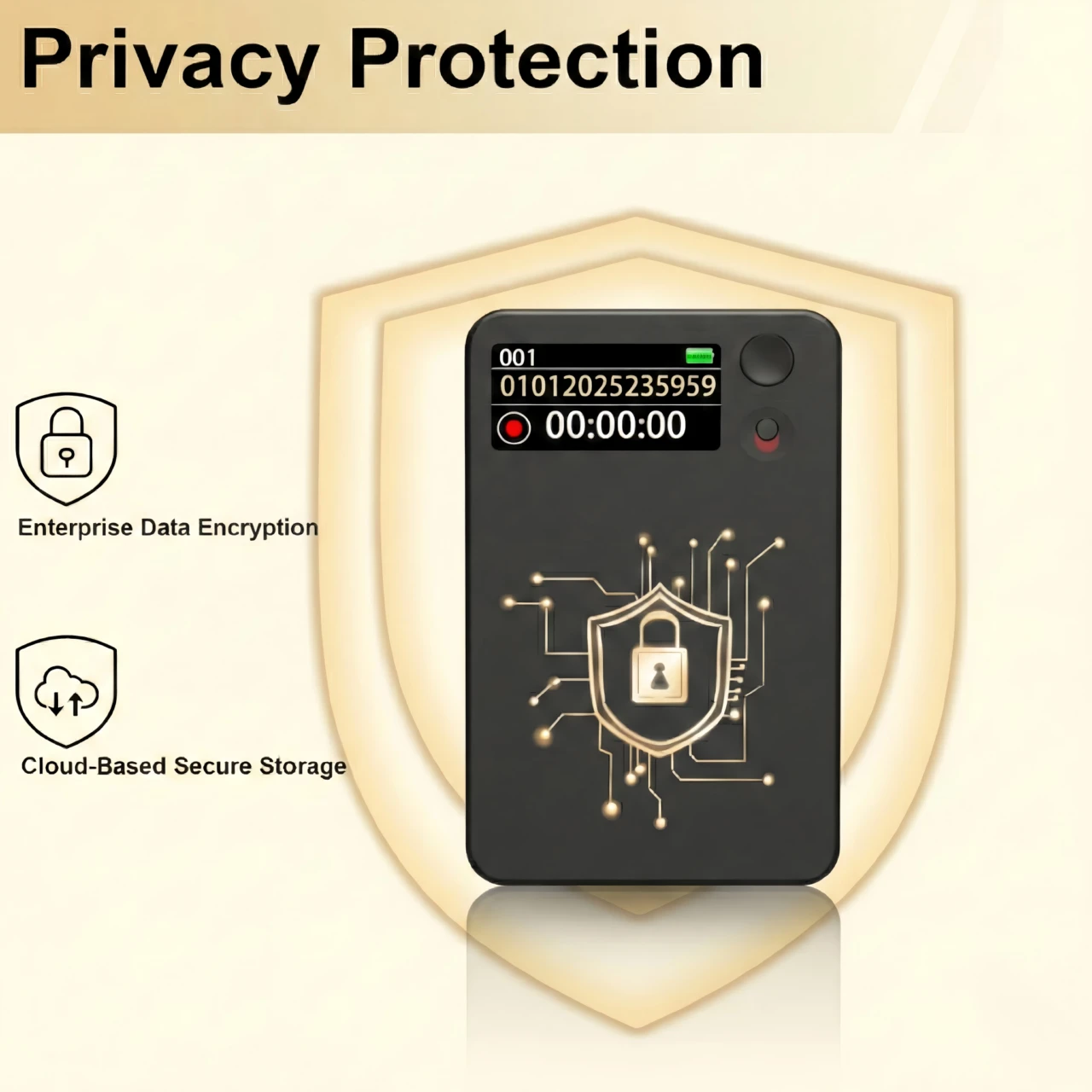 Data security is a primary design feature. All recordings are protected with local device encryption to prevent unauthorized access. When using the app, data is transferred and stored in a secure, encrypted environment, ensuring the confidentiality of sensitive business information.