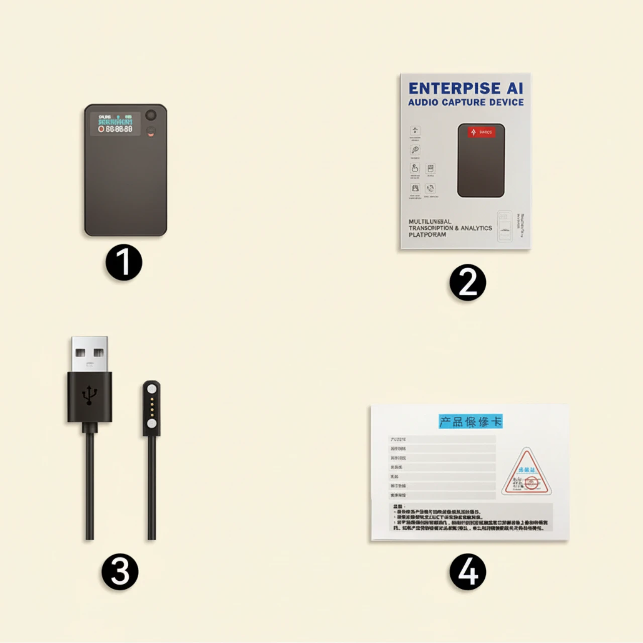 This device includes a scalable, cost-effective transcription service model. Each unit comes with 400 free transcription minutes per month without a subscription, allowing businesses to evaluate the service. For higher volume needs, additional minute bundles can be purchased directly through the application, offering a pay-for-use model that adapts to business requirements.