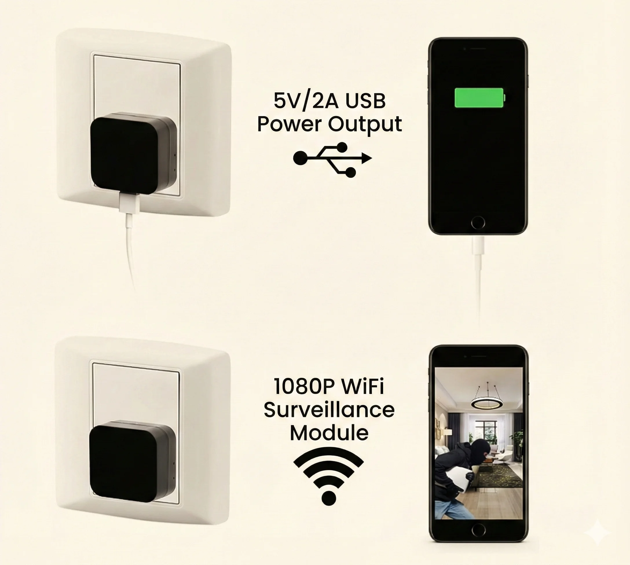 The unit operates as a functional wall socket or charger, allowing for strategic placement in offices, warehouses, or retail spaces. This dual purpose is key to its effectiveness, ensuring it remains unnoticed during operation and provides continuous power for uninterrupted surveillance.