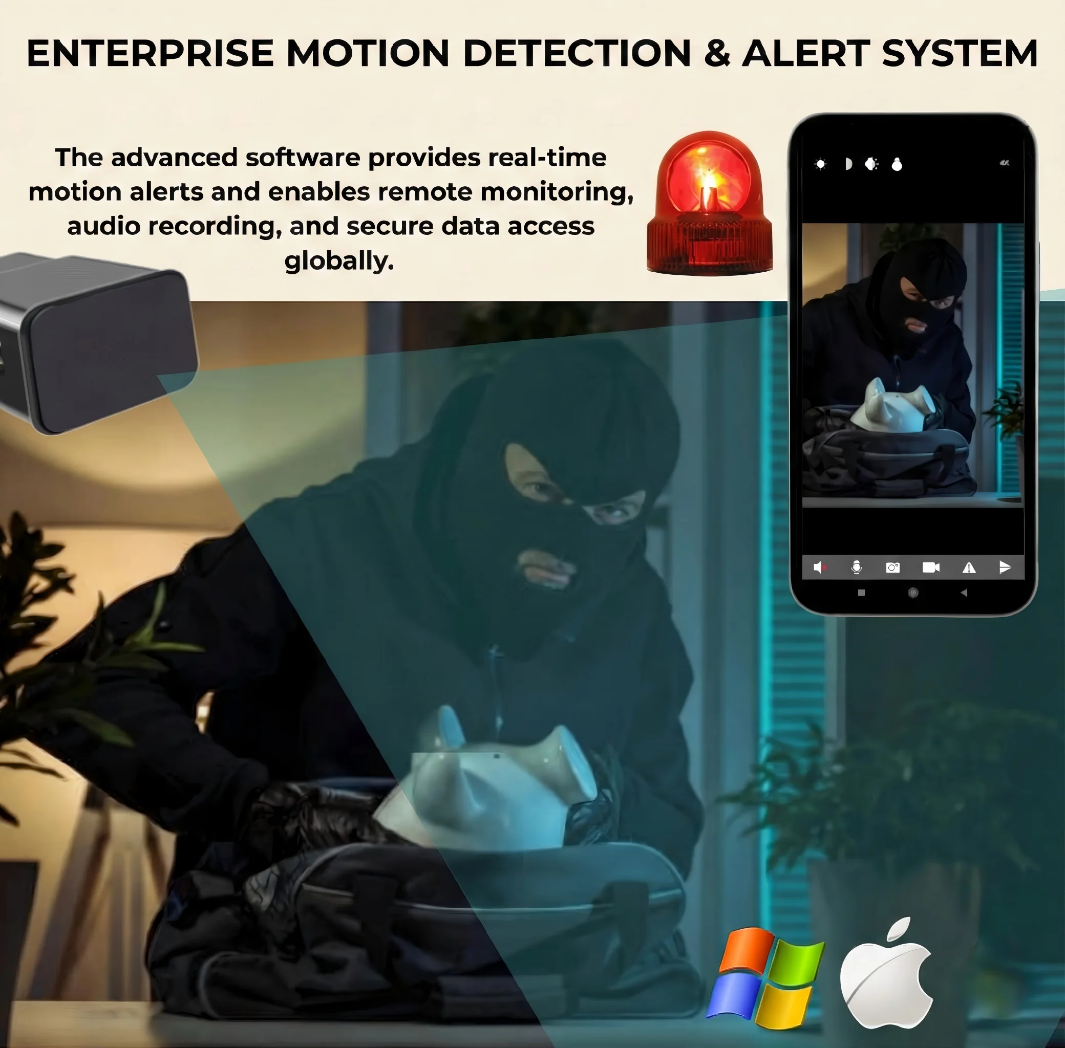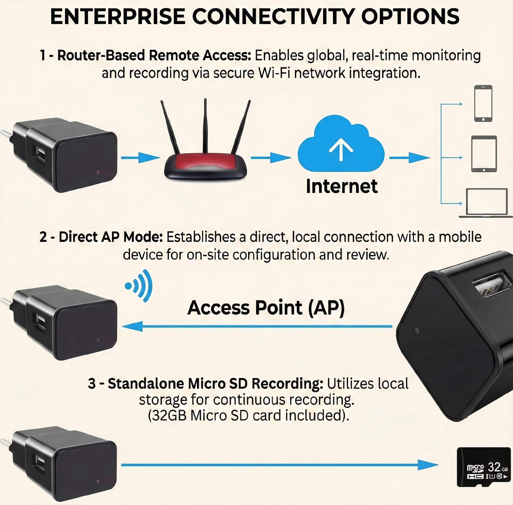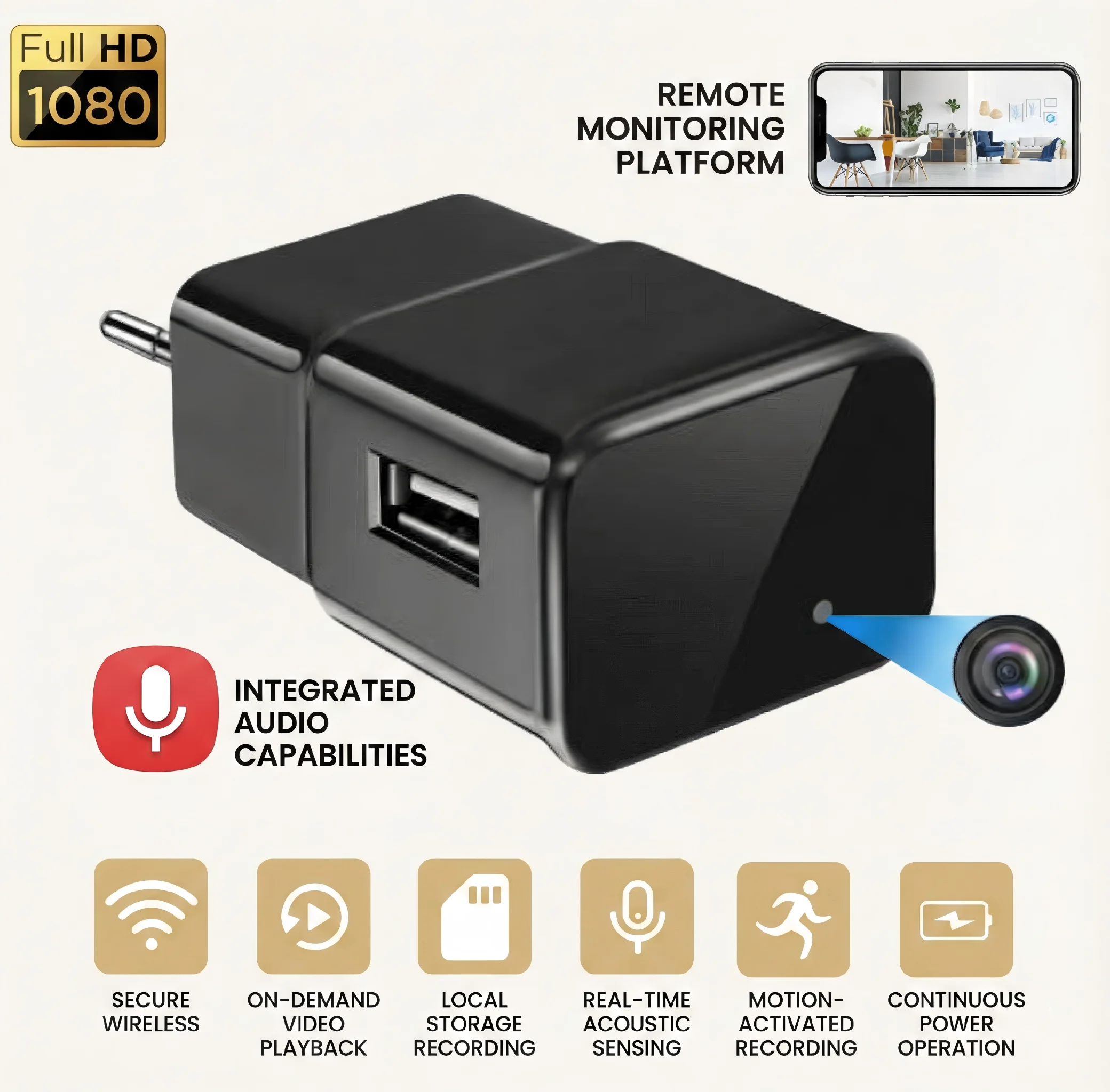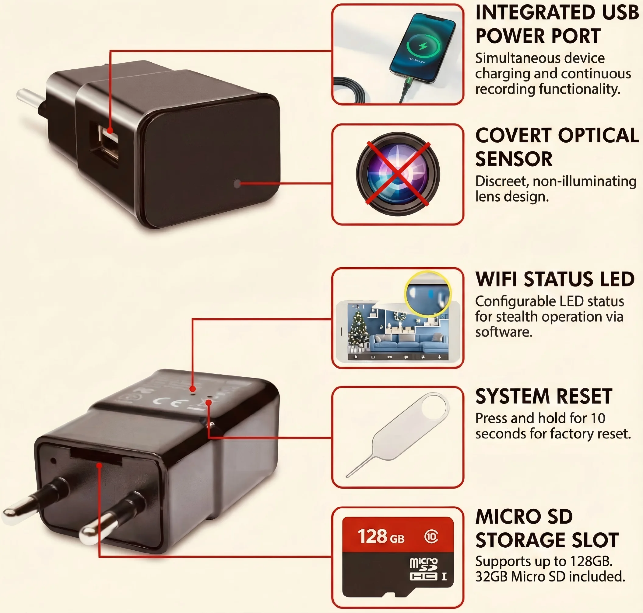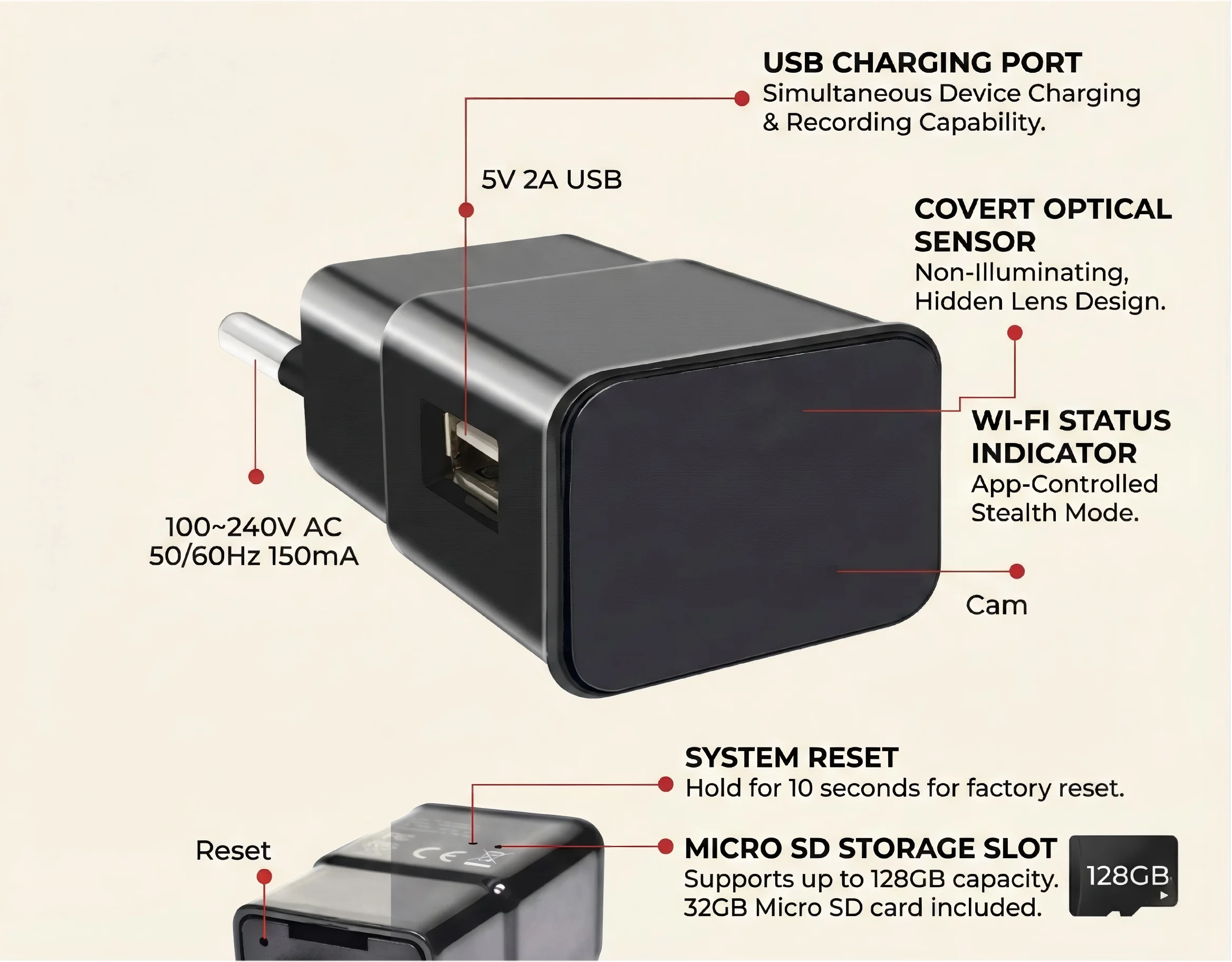 - Design nascosto non rilevabile: La telecamera è perfettamente nascosta all'interno di un normale caricabatterie USB, rendendola praticamente impossibile da individuare. Questa è la principale proposta di valore per i clienti che necessitano di una sorveglianza discreta.