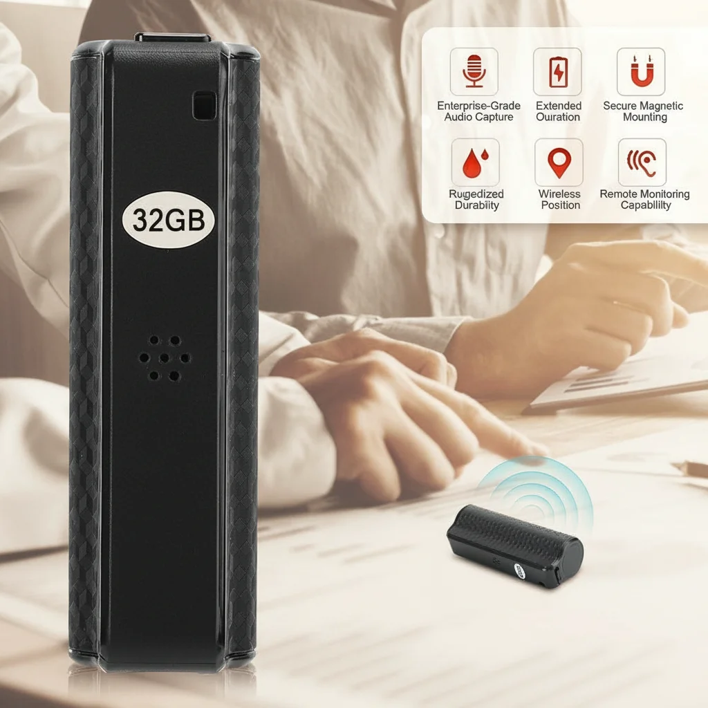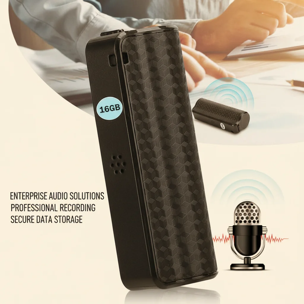 This professional voice recorder is engineered for extended duration and reliable performance in various business environments. Its design focuses on operational longevity, ease of deployment, and high-quality audio capture for professional use cases.
