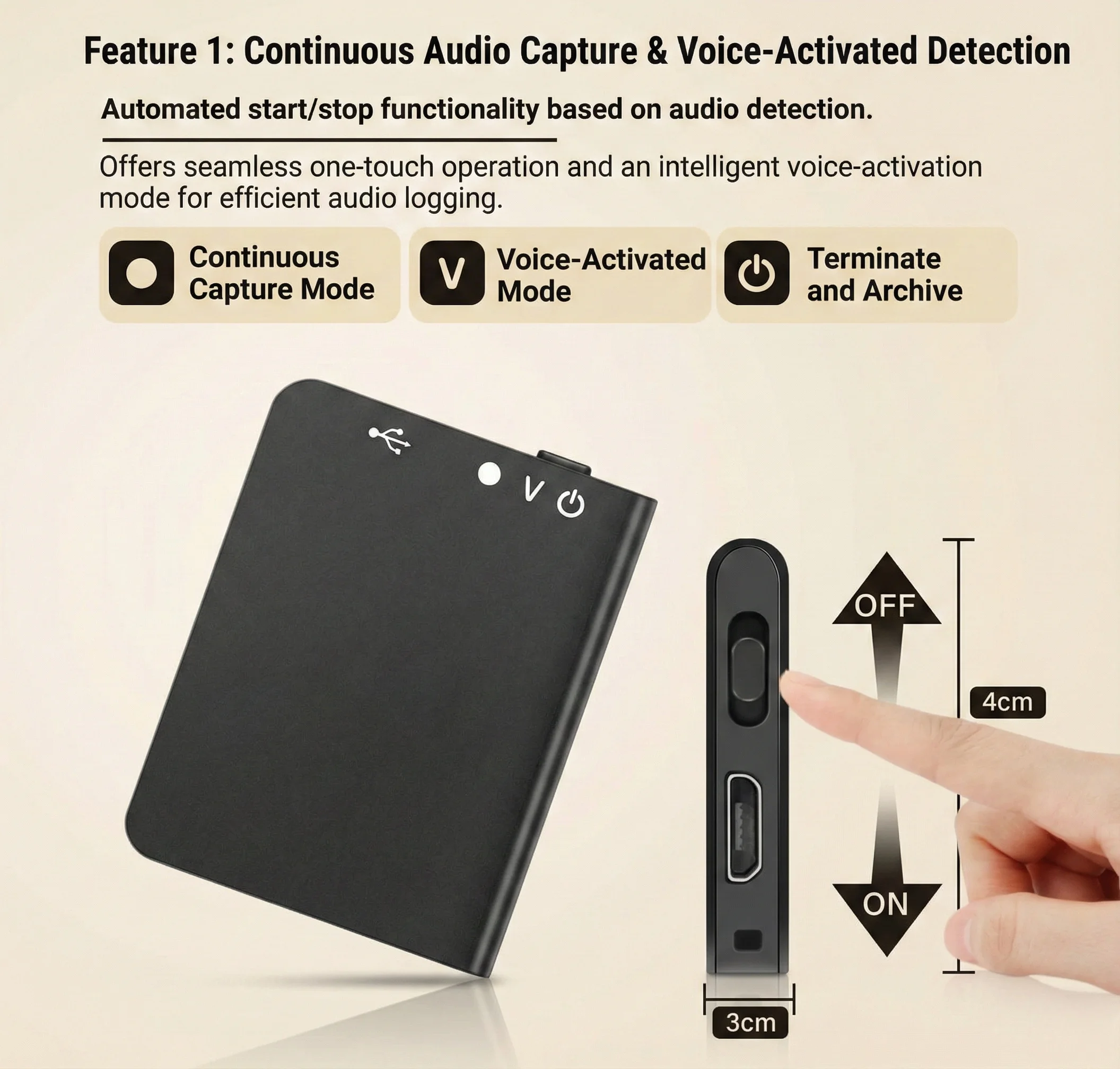 - One-Touch Operation: A simple slide switch initiates recording instantly, ensuring no critical moments are missed. Ideal for rapid deployment in interviews, meetings, or field operations.