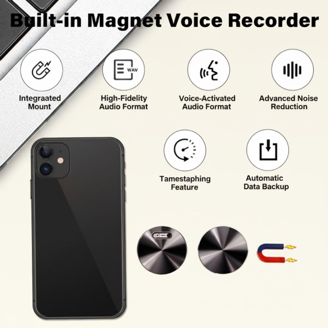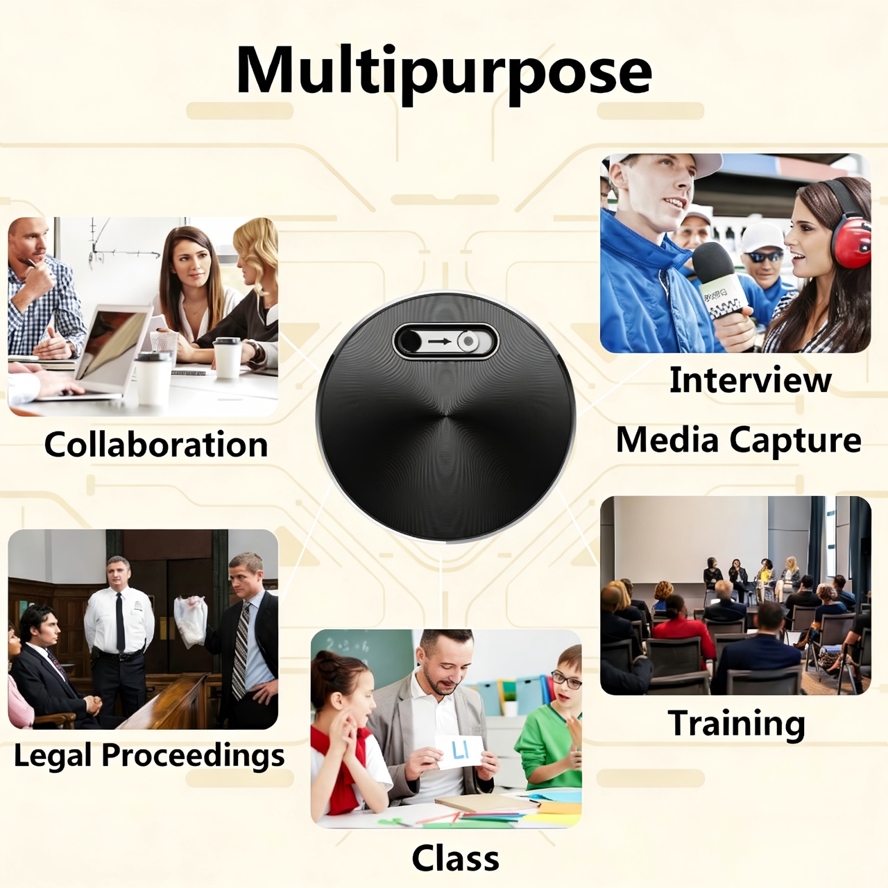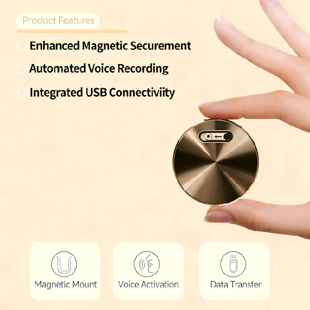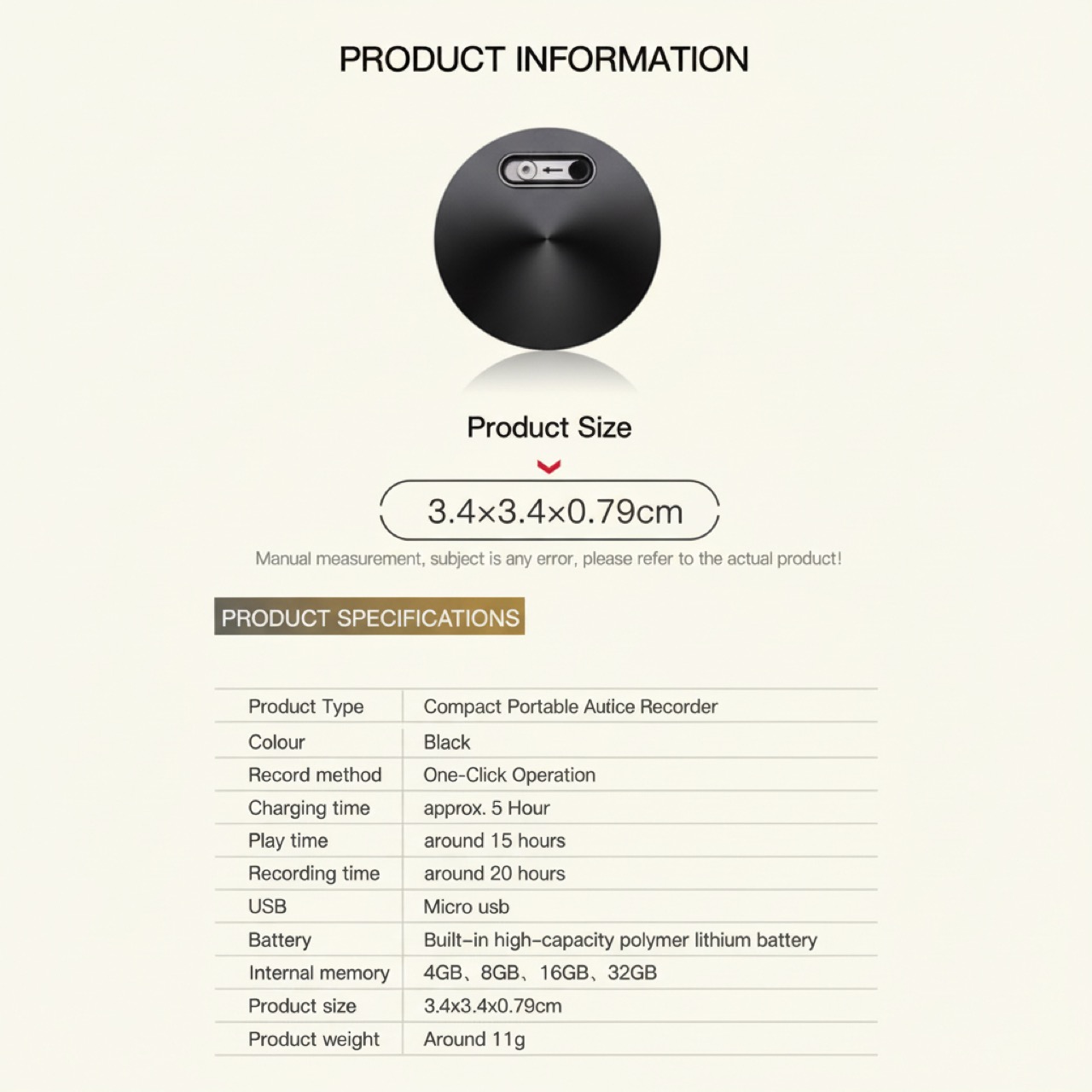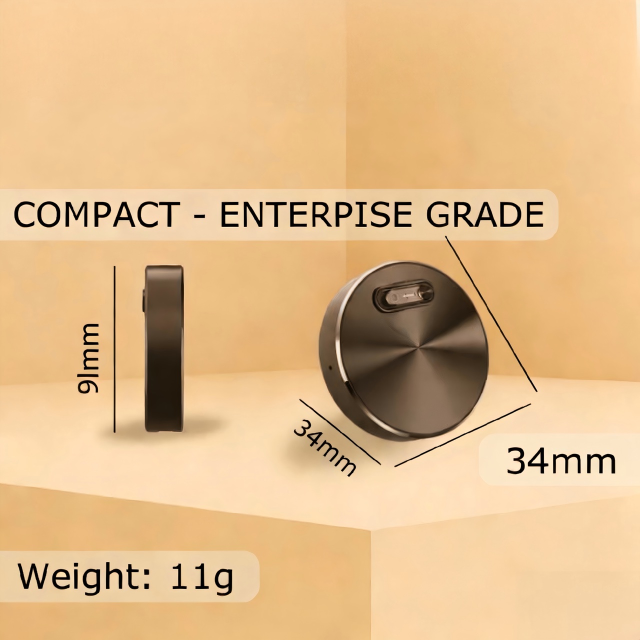 With dimensions of only 34 x 34 x 7.9 mm and a weight of 11g, the device is exceptionally small and lightweight. Its discreet form factor allows for unobtrusive placement in various professional settings, from conference rooms to personal workspaces.