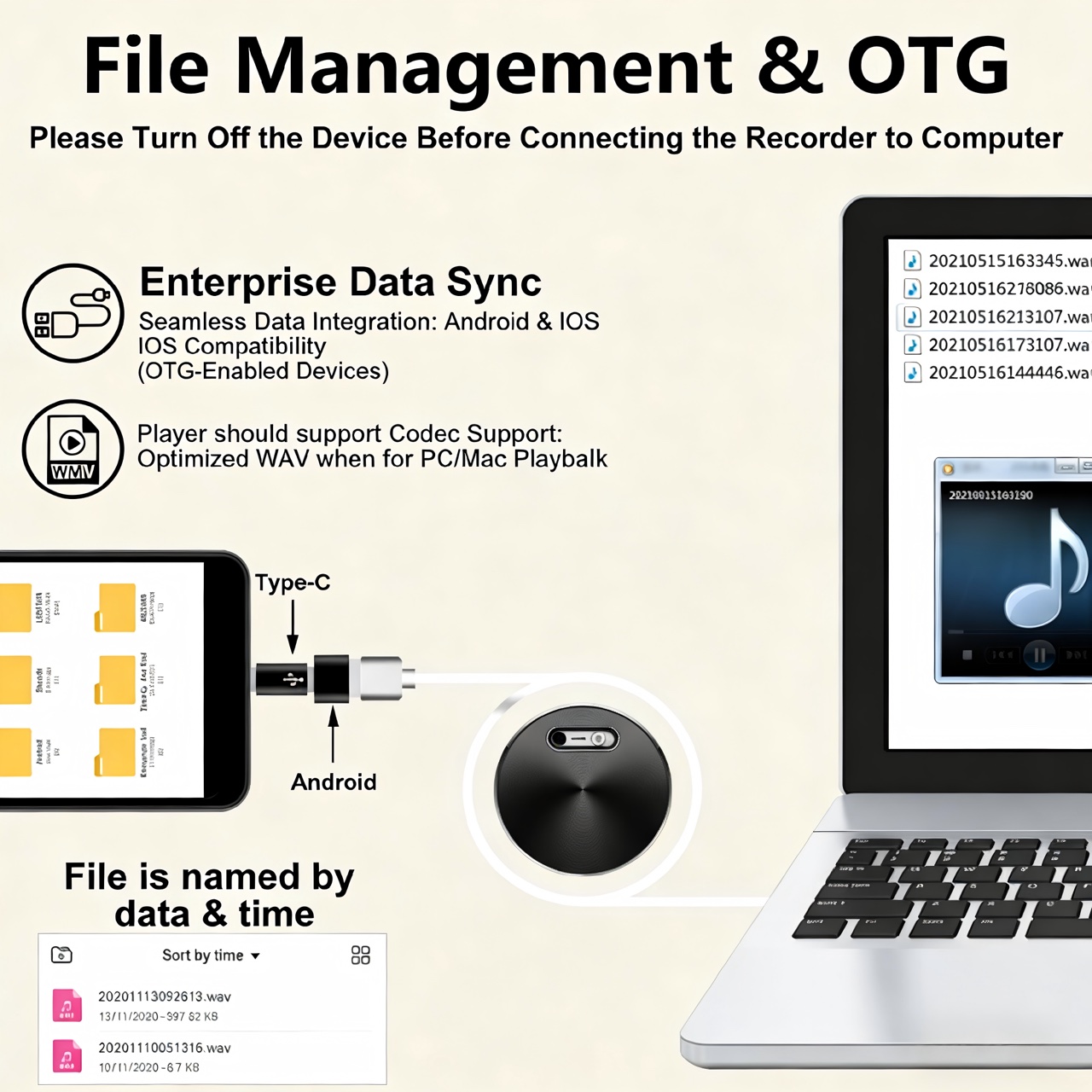 Designed for immediate use with a single on/off button for recording. Accessing files is simple: connect the device to any PC or laptop via the included USB cable. No specialized software is required for file playback or transfer, ensuring compatibility with standard IT infrastructures.