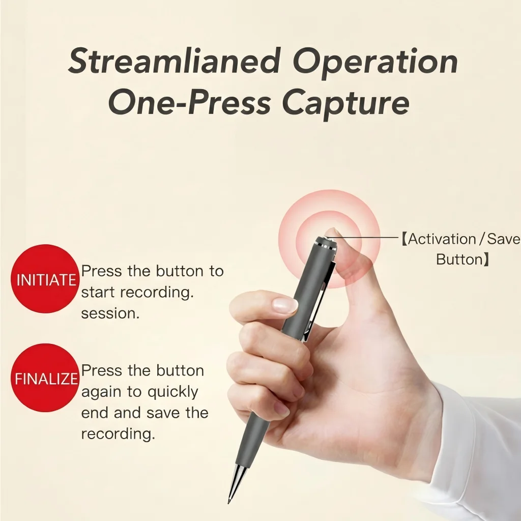 - Discreet Operation: The standard pen form factor allows for unobtrusive recording in sensitive business environments such as negotiations or interviews.