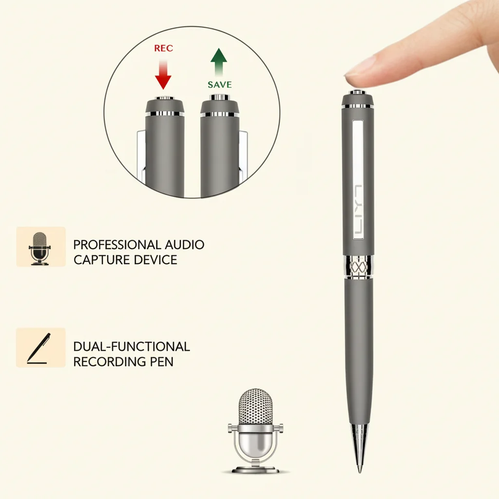 This device integrates a high-fidelity voice recorder, a portable USB flash drive, and a functional writing pen into a single, professional chassis. It is designed to enhance efficiency for business operations.